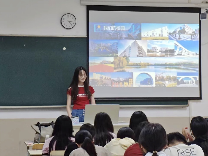 王昊宇为同学们分享自己的备考经历和现阶段的学习生活。她首先简要介绍了上海对外经贸大学先进的教学设施、浓厚的学术氛围以及突出的区位优势带来的实习实践机会。同时,她也特别提出,研究生课程强度大、要求高,但项目式的学习模式以及与相关专业领域的紧密联系,极大地锻炼了自己的翻译能力。此外,她还就如何利用好学校资源、平衡学习与生活等提出了实用建议,引起了现场同学的强烈共鸣。