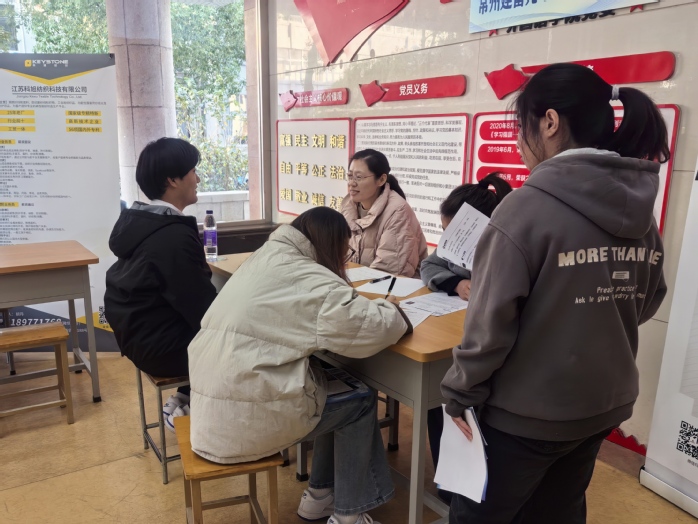 在常州建富光电仪器有限公司的展位前,应聘学生排起长队。该企业位于武进区牛塘镇,是我院院企合作共促就业的重要伙伴。学院2025届毕业生汪看影、曾艳艳同学毕业后已入职外贸岗位,2026届毕业生22日语1班张金月同学也在此实习。正在面试的22日语1班周舟同学表示,该企业福利待遇较好,符合自己的求职意向,目前已投递简历,希望能够顺利入职。