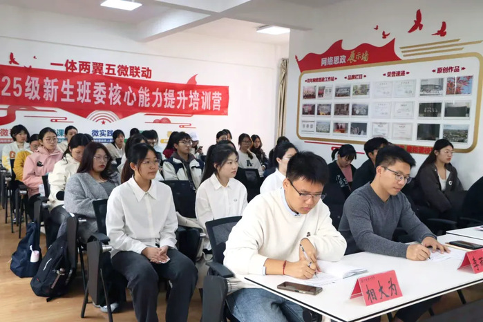 为进一步加强学生骨干队伍建设,提升学生干部管理能力和服务水平,充分发挥学生干部桥梁纽带作用,2025年11月11日中午12点30分,外国语学院筑梦·追光第四届学生干部培训—一站式学生社区特色活动在38号楼“一站式”学生社区网络思政中心顺利举行。外国语学院党委副书记兼副院长李晓曼、校党委宣传部网络思政中心科长李雨恒、院团委副书记陈凌峰、25级辅导员相大为、23级优秀学生干部代表、25级学生干部代表出席了本次会议。动由2025级德语专业的单一诺同学主持。