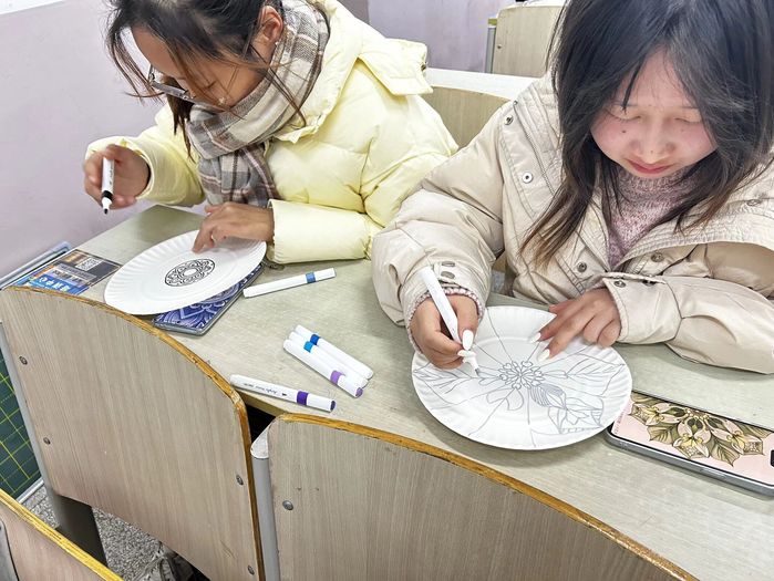 活动伊始,主持人对活动背景与流程进行了简要介绍。在随后的DIY创作环节中,同学们领取白色纸盘、水彩笔、贴纸等材料,围绕曼陀罗图案展开自由创作。现场氛围专注而宁静,同学们将内心的情绪转化为线条与色彩,不少参与者还结合专业所学,在作品旁用英语、日语、语等不同语种写下表达情感的词汇或句子,赋予作品更丰富的文化内涵与个人情感。