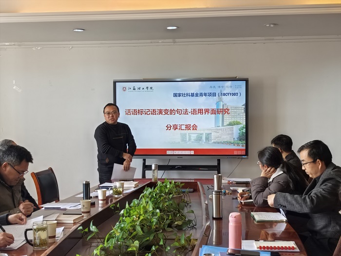 12月17日下午,外国语学院教师学术成果研究研讨会在外语楼210会议室举行。会议就学院杨国萍博士的学术专著《话语标记语演变的句法—语用界面研究》进行专题研讨和学术交流。校社科处副处长王斌教授、外国语学院党委书记王毅教授、院长张鑫教授、校学术委员会委员张德福教授,以及学院青年博士、学术骨干教师三十余人参加研讨。研讨会由外国语学院副院长李世存主持。
