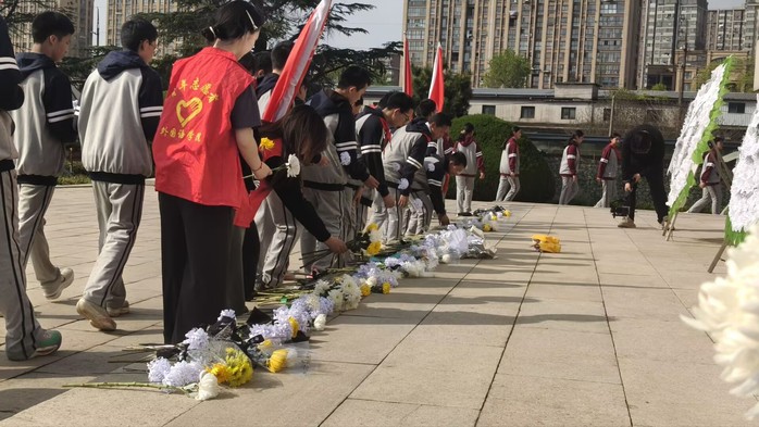 在庄严肃穆的烈士纪念碑前,全体师生整齐列队,奏唱国歌、集体默哀、敬献花圈,表达对革命先烈的深切缅怀与崇高敬意。